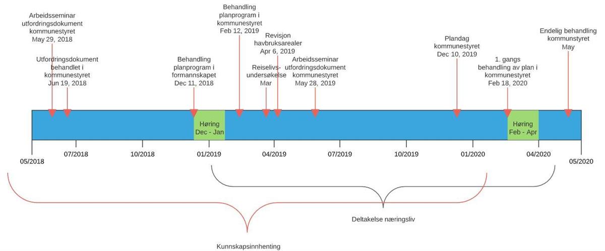 Planprogrammet for næring ble sammen med tre andre kommunedelplaner behandlet i formannskapet 11. desember 2018, med påfølgende 6 ukers høring med frist 23. januar 2019. Ved fristens utløp var det ikke kommet merknader til planprogrammet. Formannskapet behandlet planprogrammet 6. februar i sak PS 008/19, hvor det kom inn ett forslag til tillegg i temaer i planen. Planprogrammet ble vedtatt i kommunestyret 12.02.2019 i sak PS 011/19.
