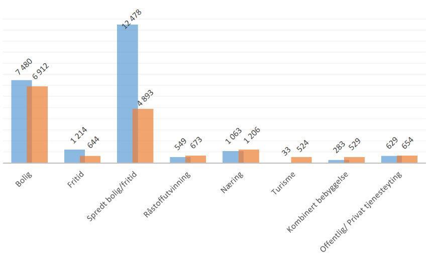 Arealregnskap - sammenligning gamme arealplan (blå) med forslag på 2. gangs høring november 2019 (orange)